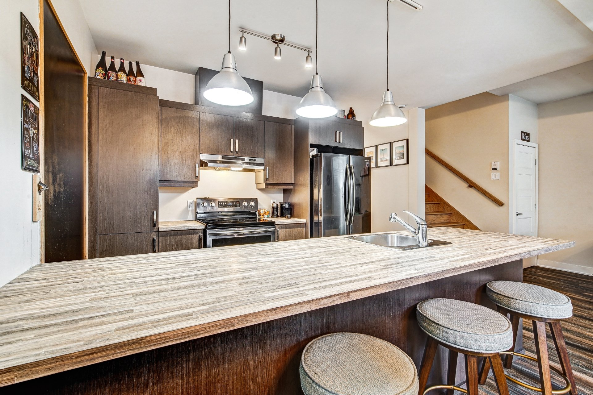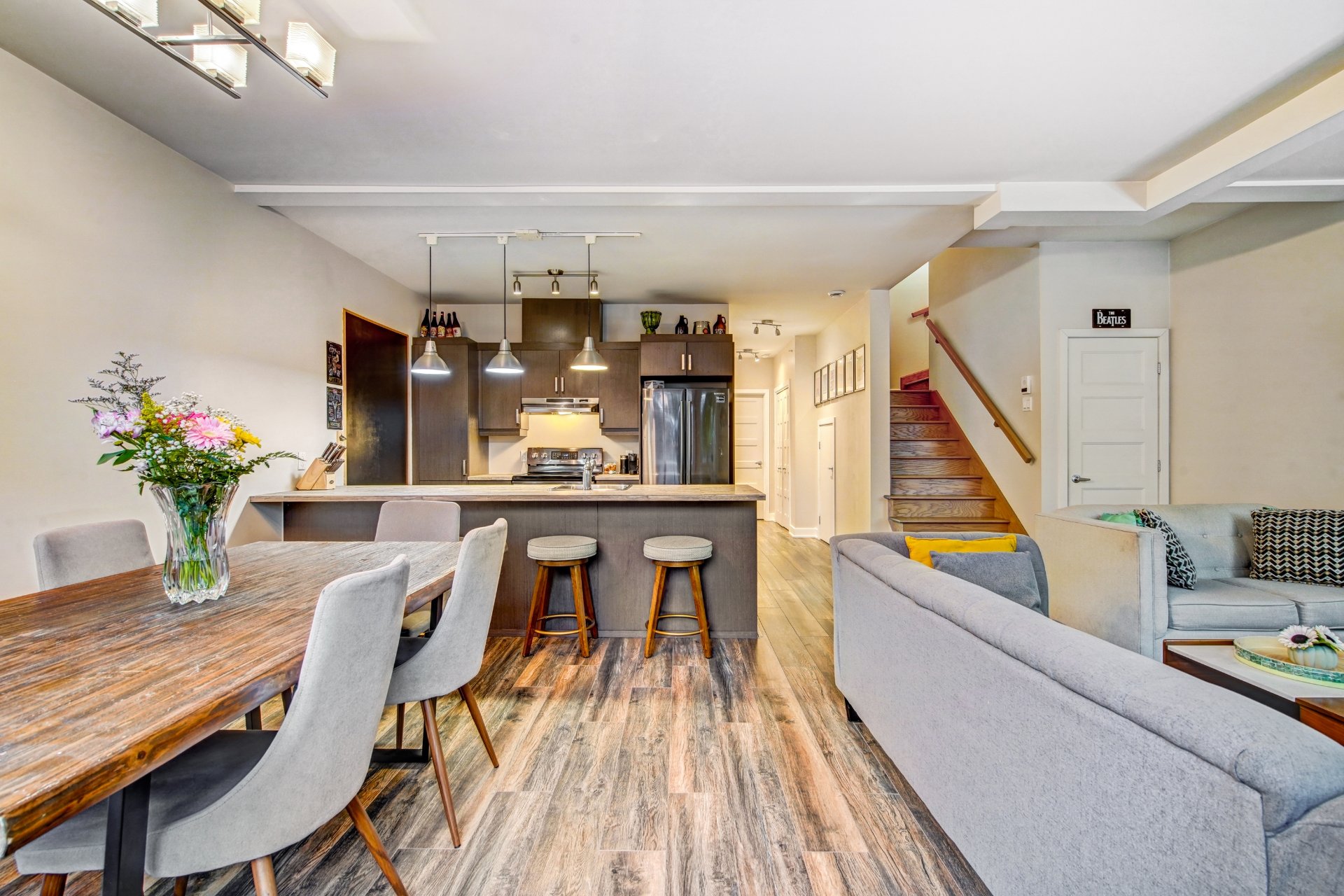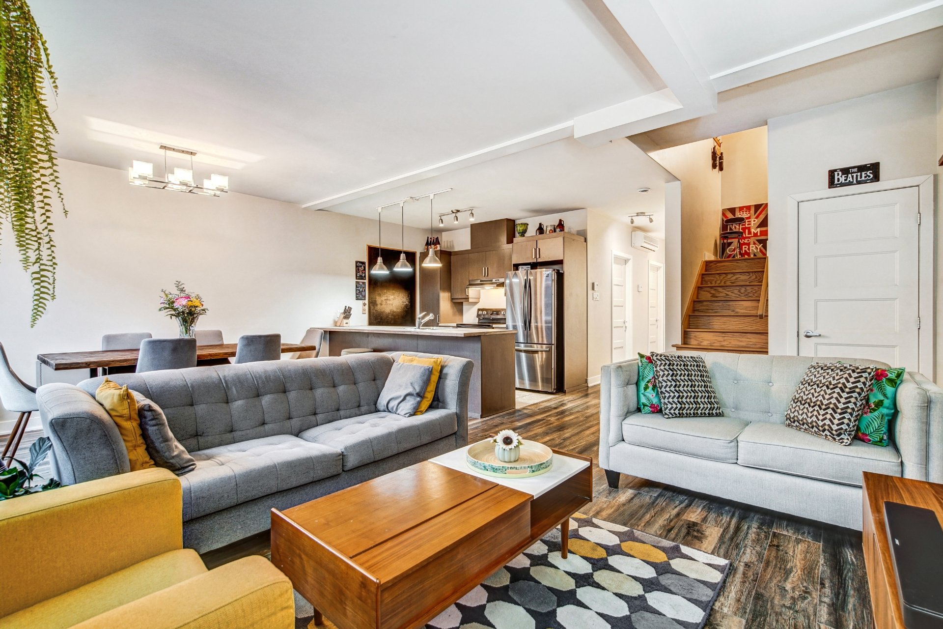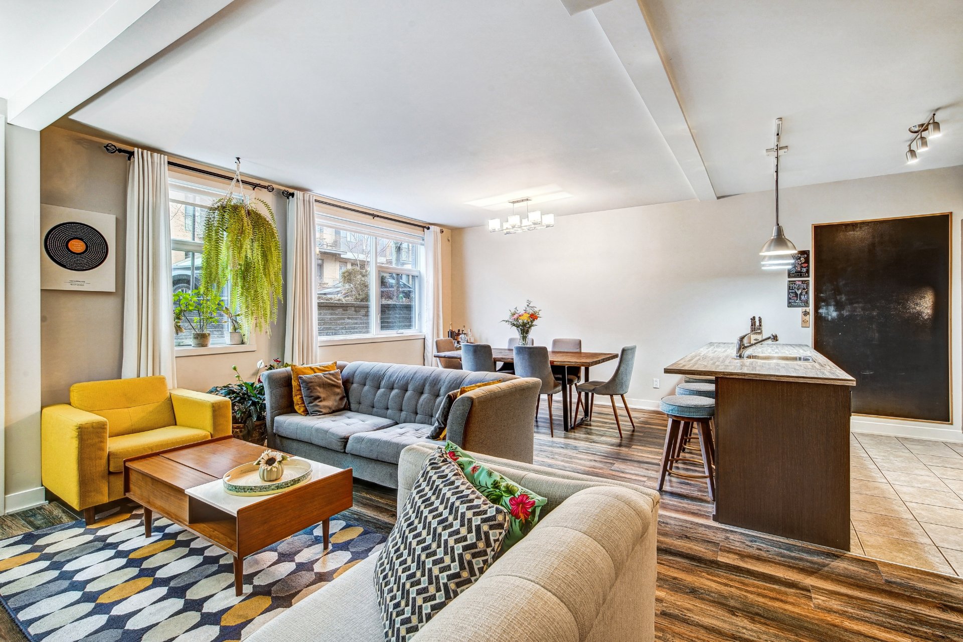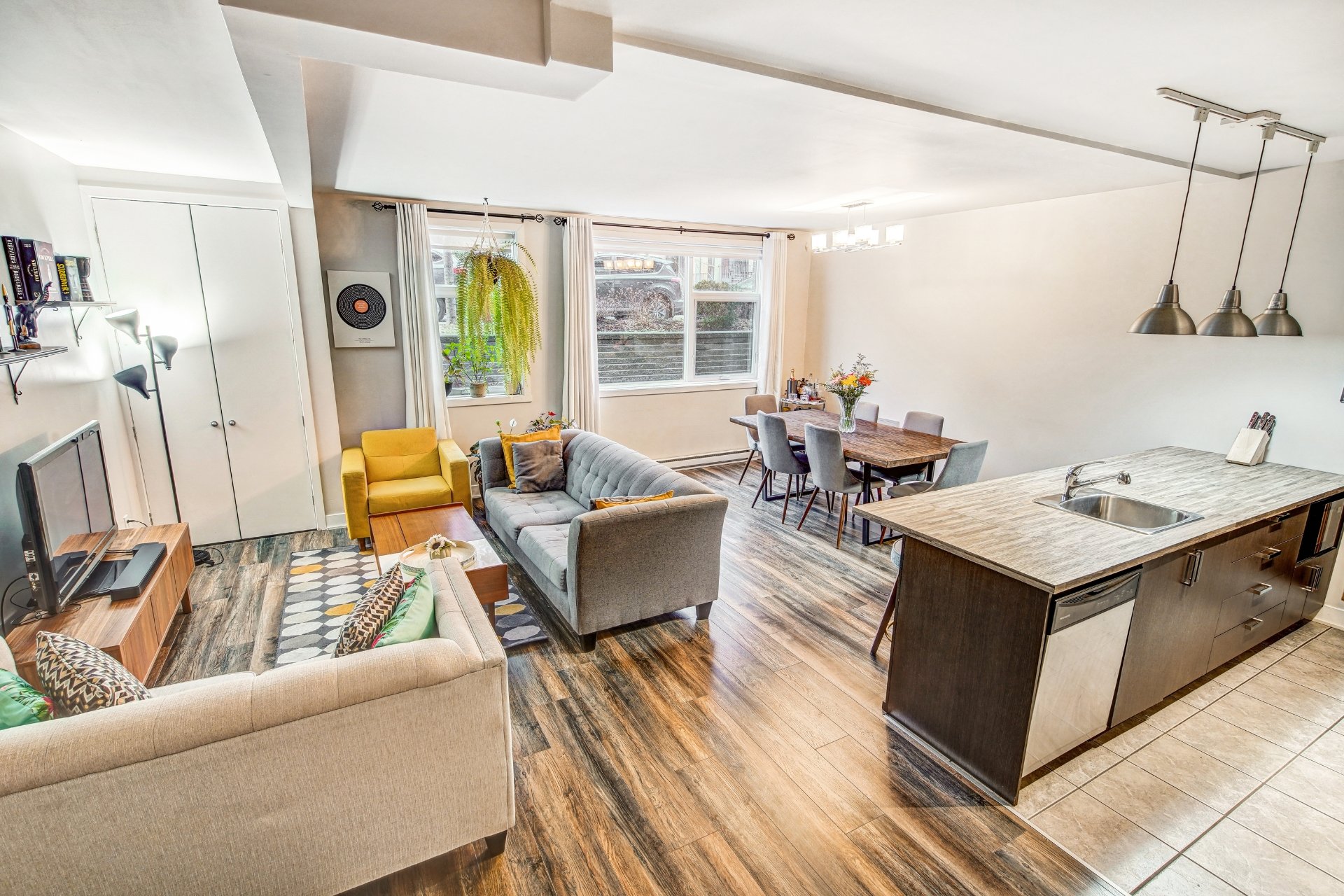 Inclus : four, frigidaire, laveuse, sécheuse, lave-vaisselle, micro-ondes, tous les luminaires et rideaux